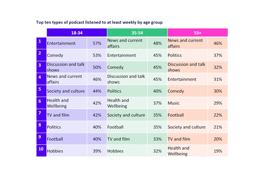 팟캐스트 이용 패턴 역시 연령대에 따라 차이를 보인다. 18~34세 이용자 집단에서는 엔터테인먼트(57%), 코미디(53%), 토크 프로그램(50%) 등 오락 중심 콘텐츠 이용 비중이 높은 반면, 35~54세와 55세 이상 연령대에서는 뉴스와 시사 프로그램 이용 비중이 상대적으로 높게 나타났다. 이러한 결과는 팟캐스트가 단순한 오락 콘텐츠를 넘어 뉴스와 시사 정보 전달 플랫폼으로도 활용되고 있음을 보여준 것으로, 오디오 콘텐츠 소비가 연령대별로 서로 다른 정보 및 오락적 욕구를 반영하고 있다고 해석된다.4)