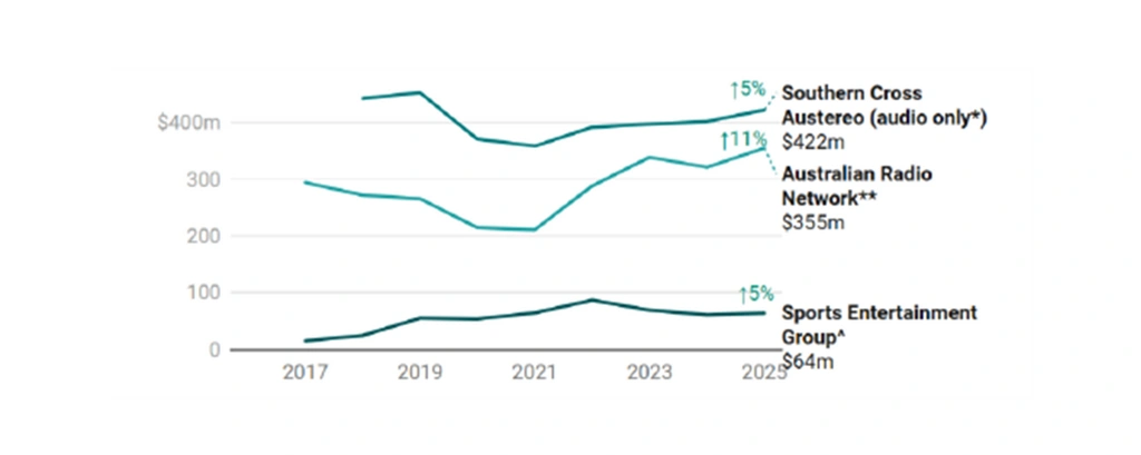 호주 라디오 산업은 여전히 광고를 핵심 수익원으로 삼고 있으나, 최근 수년간 산업의 수익 기반은 전통 라디오(AM/FM) 중심 구조에서 디지털 오디오를 포함한 복합 구조로 빠르게 이동하고 있다. 호주 상업 라디오는 오랫동안 광고시장 성장세와 보조를 맞춰 왔으나, 디지털 광고 급성장과 팬데믹 이후 광고시장 재편으로 인해 전통 라디오 광고 점유율은 감소 추세를 보이고 있다.1) 2007~2021년 전체 광고시장에서 디지털 광고 비중은 11%에서 64%로 확대되고, 상업 라디오 광고 점유율은 동 기간 8.4%에서 7.6%로 하락했다. 상업 라디오 광고수익은 2007년 9억 3,100만 호주달러에서 2019년 12억 3,500만 호주달러까지 증가했으나, 팬데믹 시기 9억 8,900만 호주달러로 감소한 뒤 2021년 10억 3,200만 호주달러 수준으로 부분 회복하는데 그쳤다. 이는 상업 라디오가 여전히 광고 의존 산업이라는 점을 보여줌과 동시에, 광고시장에 매우 민감한 구조임을 보여준다. 주목할 점은, 전반적인 방송광고 감소 추세에도 불구하고, 오디오 시장 전체 수익은 증가한다는 점이다. 호주 통신미디어청2)(Australian Communications and Media Authority, 이하 ACMA)이 발간한 '호주의 커뮤니케이션 미디어 시장 현황 보고서'에 따르면, 2016~2025년까지 SCA, ARN, Sports Entertainment Group(이하 SEG) 등 주요 오디오 사업자들의 연매출은 꾸준히 증가하는 추세다. 특히 2024~25년 기준 SCA는 약 4억 2,200만 호주달러, ARN은 약 3억 5,500만 호주달러, SEG는 약 6,400만 호주달러라는 매출을 기록했는데, 이는 전년 대비 각각 5%(SCA), 11%(ARN), 5%(SEG) 증가한 수치다. 기존 방송 매출만으로는 설명하기 어려운 성장으로, 실시간 재생 서비스·팟캐스트·디지털 광고 등 확장된 오디오 사업이 매출 증대에 기여하고 있음을 보여준다.