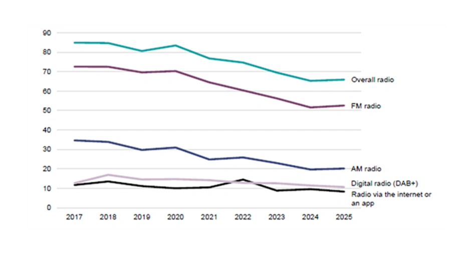 호주통신미디어청(Australian Communications and Media Authority, 이하 ACMA)의 미디어 시장 현황 보고서에 따르면, 2025년 기준 전체 라디오 청취 경험은 66% 수준으로, 2017년의 85%에 비해 낮아졌지만 2024년 이후 비교적 안정화되고 있다. 이는 라디오가 과거 같은 절대적 대중매체의 위치를 유지하지 못하더라도, 여전히 상당한 범위의 이용자에게 일상적 매체로 기능하고 있음을 보여준다. 매체별로 보면 FM과 AM 모두 장기 하락세를 경험했지만 최근에는 하락 폭이 둔화되었다. 2025년 FM 청취율은 53%로 2024년 청취율(52%)과 유사한 수준이며, AM은 20% 수준으로 비교적 안정적이다. 하지만 전체적인 추세가 FM은 2017년 73%에서 2025년 53%로, AM은 35%에서 20%로 감소하고 있다. 호주 청취자들의 라디오 이용은 여전히 FM 중심이지만, 전통적 채널 중심 청취는 점차 축소되는 반면, 일정 수준의 핵심 이용층이 유지되는 방향으로 재편되는 것으로 보인다.