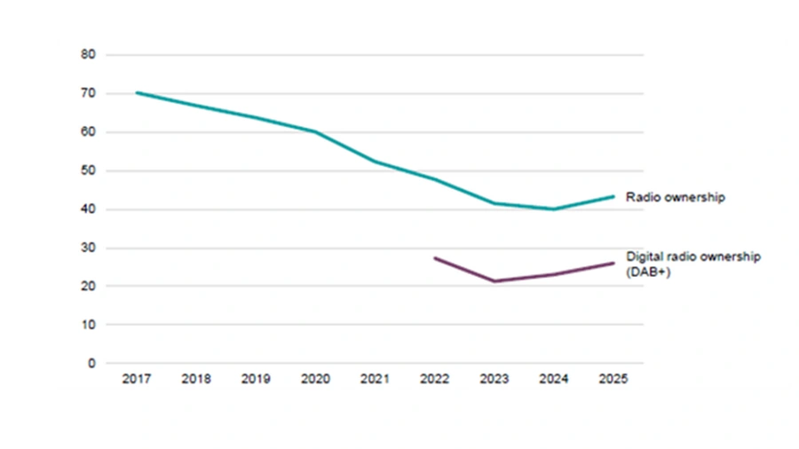 라디오 기기 소유에도 변화가 나타난다. 2025년 전체 라디오 수신기 보유율은 43%로 전년의 40% 대비 소폭 증가했으며, 디지털 라디오 보유율 역시 23%에서 26%로 상승했다. 특히 디지털 라디오 기기 보유율은 49%에서 55%로 증가했는데, 이는 호주 청취자들이 고정형 가정용 수신기뿐 아니라 개인화된 이동형 수신기 사용 환경에 익숙해짐을 시사한다. 전체적으로, 라디오 기기 보유율은 2017년 70%에서 크게 하락한 뒤 최근 소폭 반등한 수준이라는 점에서, 이러한 증가를 라디오 산업 성장의 직접적인 지표로 해석하기는 어렵다. 오히려 라디오 소비가 전용 수신기보다 스마트폰, 앱, 자동차, 연결형 기기 등 다양한 매체로 분산되고 있음을 보여준다. 특히 젊은 층(18~44세)의 경우 라디오 수신기 보유율이 18%에서 27%로, 디지털 라디오는 14%에서 21%로 증가한 것으로 나타나, 이 연령층에서 라디오 소비가 재편되고 있음을 보여준다.