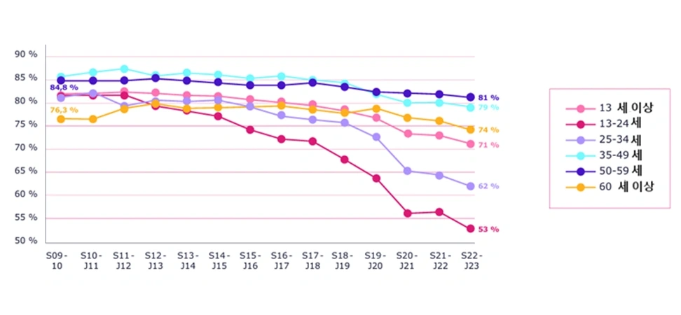 - 12) 물론 오디오 콘텐츠에는 실시간 재생 서비스 음악 서비스, 팟캐스트 등도 포함되어 있기 때문에, 라디오를 듣기 위해 스마트 미디어가 가장 많이 사용되고 있다고 단언하기는 어렵다. 다만, 여전히 라디오를 듣는 비율(78%)이 전체 오디오 콘텐츠 이용에서 압도적으로 높게 나타난다는 점에서 라디오 이용에도 스마트 미디어가 과거보다 라디오 청취에 많이 이용되고 있음은 쉽게 짐작할 수 있다. 또, 스마트 기기 이용 비율이 연령대에 따라 크게 차이가 나는 것도 고려해야 한다. 실제, 일반 라디오를 이용해 청취하는 비율이 15-24세 연령의 경우 약 33%인 것에 비해, 50세 이상은 각각 72%에 이른다는 점, 반대로 스마트폰을 이용해 청취하는 비율이 15-24세는 74%에 이르고, 60-64세는 62%, 65세 이상은 56%라는 점에서 연령대 이용 기기 차이가 크게 나타난다 (Arcom, 2025.4.3.).