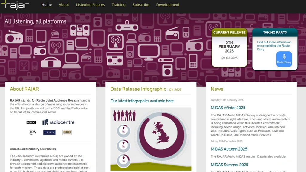한국은 청취율 조사가 인지도 조사에 가까우니까요. 라디오 산업계 종사자 상당수가 체계를 바꿀 필요성을 공감할 거예요. 영국은 청취율 조사를 국가 기관에서 합니다. 조사를 진행하고 결과가 나오면 깔끔하게 요약된 인포그래픽으로 제공합니다. 한 번이라도 라디오를 들은 사람, 청취자당 주당 평균 시간, 디지털 플랫폼 비율, 라디오를 듣는 방식까지 나오는 의미 있는 정보에요. 영국 라디오 청취 조사기관 '라자르(RAJAR, Radio Joint Audience Research)'에서 조사하고 발간하는 보고서입니다.