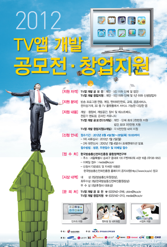 방송통신발전 기본법 제26조에 의하여 「2012년도 방송통신 융합서비스 활성화 지원사업」에 관한 TV앱 개발 공모전·창업지원을 다음과 같이 공고합니다.